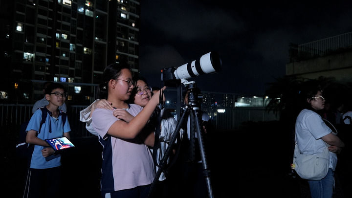 ↑2025年4月21日,深圳万科双语学校学生在教员指导下利用ATK软件测算出天宫空间站过境时间,采用望远镜观测。(新华社发 郑伟摄)