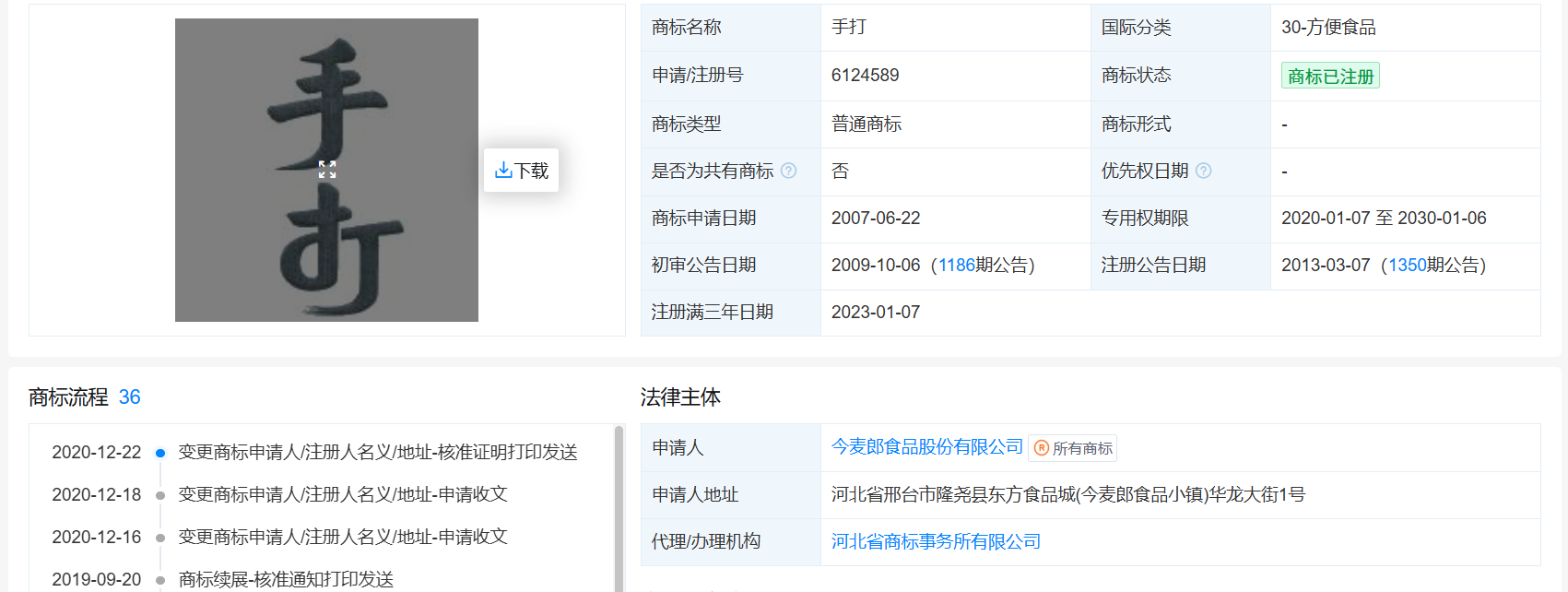 今麦郎“手打”系注册商标(天眼查截图)