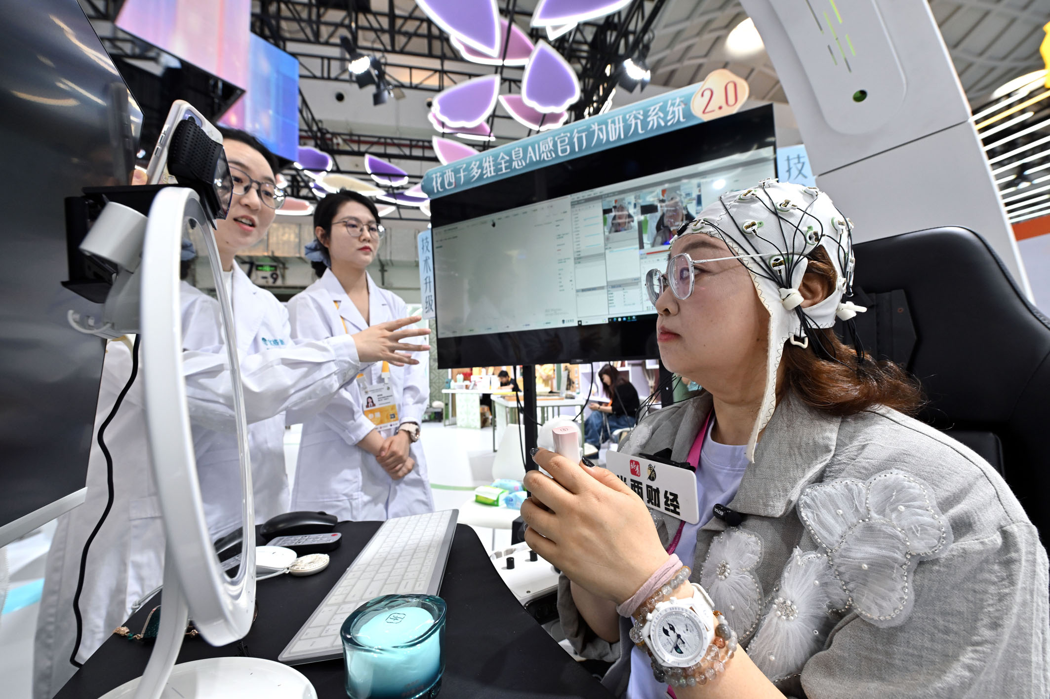 4月14日,展商在消博会现场展示美妆多维全息AI感官行为研究系统。在第六届中国国际消费品博览会中,AI赋能消费成为一大亮点。现场众多科技消费新品集中亮相,覆盖智能交互、穿戴设备、智慧健康等多个赛道。