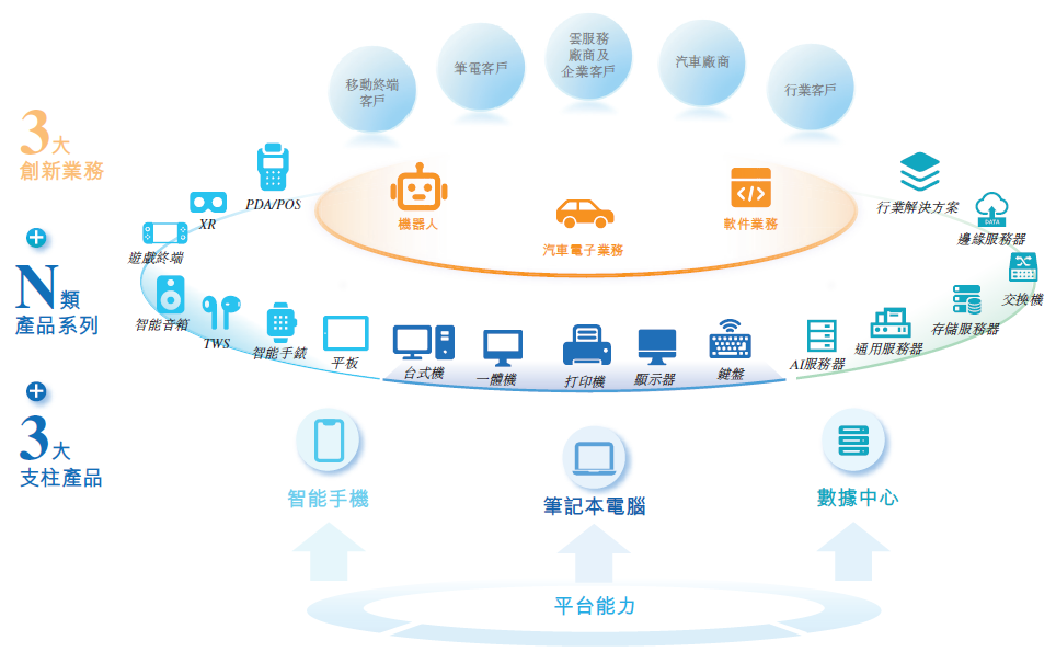 2025年华勤技术实现营收1714.4亿元,同比增长56.0%,归母净利润40.5亿元,同比增长38.6%。公司构建了“3+N+3”智能产品平台。三大支柱——智能手机、笔记本电脑、服务器——构成收入根基;N类延伸——智能穿戴、打印机、AIoT等多品类——释放收入弹性;三大创新——汽车电子、机器人、软件——开辟新增长曲线。公司是同时在智能手机、平板电脑、智能穿戴、笔记本电脑和数据基础设施五大领域建立领先市场地位的ODM厂商,2024年全球消费电子ODM出货量第一,市场份额22.5%。