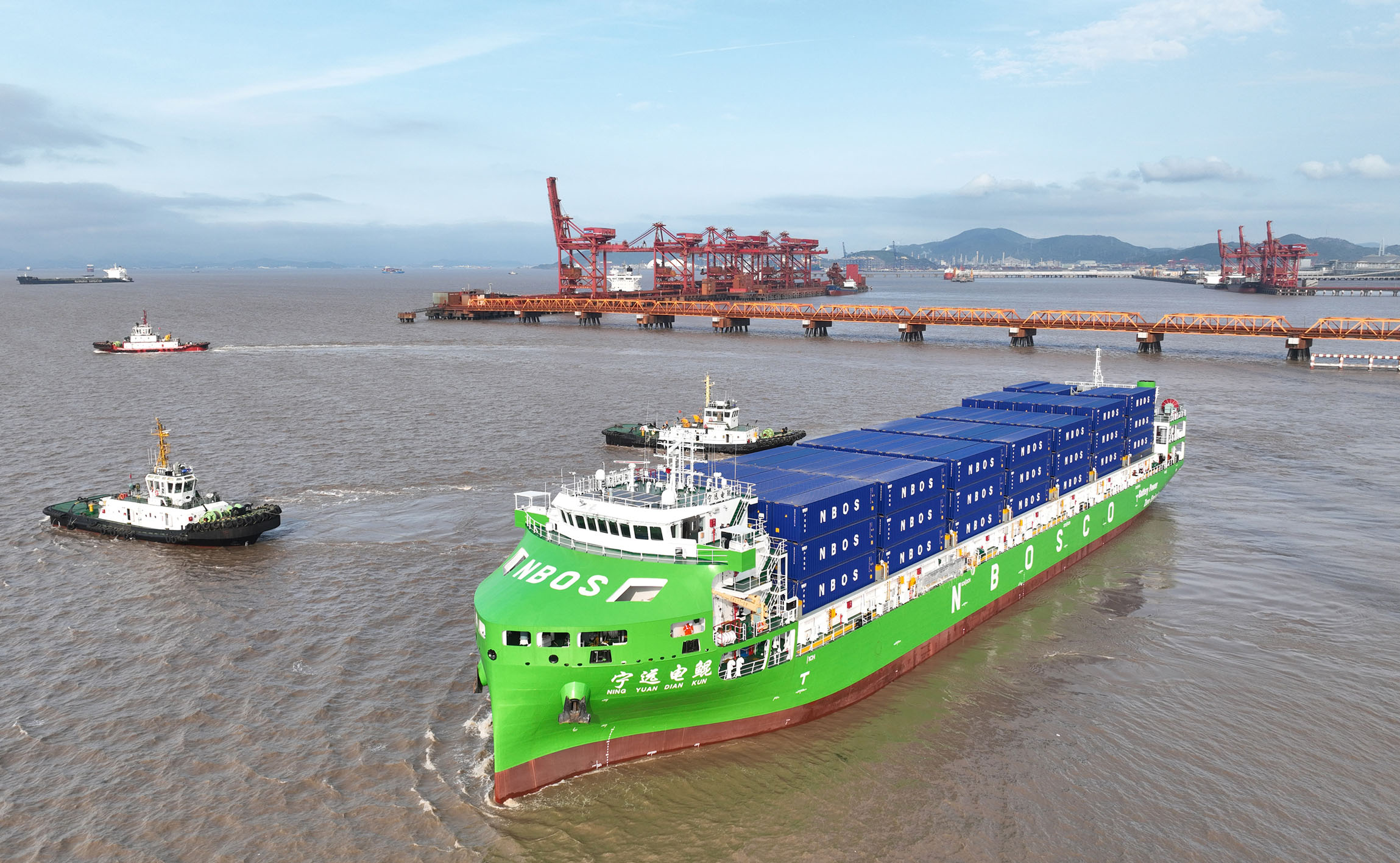 4月15日,全球最大、国内首艘万吨级纯电动智能集装箱海船“宁远电鲲”轮从宁波舟山港北仑港区启航,驶向嘉兴港乍浦港区,标志着该船正式投入商业航线运营。(无人机照片)