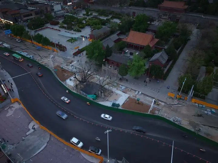 为严格保护文物、方便游客参观,2025年8月,山东省人民政府批复同意在岱庙保护范围内实施双龙池环境整治项目。3月6日,泰安市正式启动东岳大街(福全街—仰圣街)基础设施更新项目。4月13日,记者在现场看到,东岳大街夹于岱庙和双龙池之间的247.436米路段已南移11米,“搬家”至双龙池南侧。“该路段南移后已经通车,双龙池周边仍封闭铺设石材,整个项目计划4月底竣工。”施工方山东宏润市政园林工程有限公司现场安全负责人赵加栋介绍。