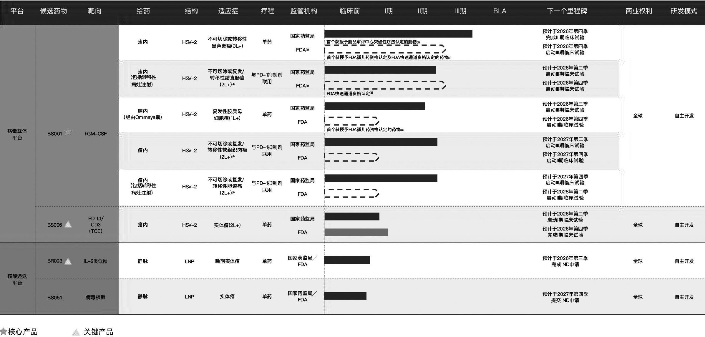 招股书显示,截至2026年3月27日,滨会生物的管线包括两款临床阶段候选药物(即BS001及BS006),以及两款临床前阶段候选药物(即BR003及BS051)。其中,BS001(OH2注射液)是全球首款进入临床阶段并推进至Ⅲ期关键试验的基于HSV-2的溶瘤病毒候选药物,有潜力成为全球首款获批的基于HSV-2的溶瘤病毒疗法。BS001已获得国家药监局及FDA用于治疗晚期实体瘤的IND批准。针对选定的实体瘤类型(包括黑色素瘤、结直肠癌、胶质母细胞瘤、软组织肉瘤及胆道癌等),公司正开发BS001作为单药治疗以及与其他药物的联合疗法。