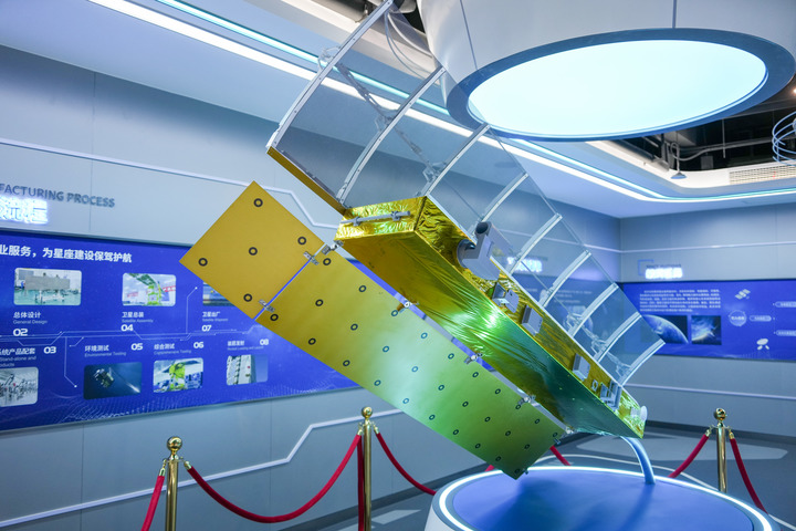 这是在济南卫星产业发展集团有限公司总装基地展示的卫星产品模型(新华社记者 徐速绘 摄)