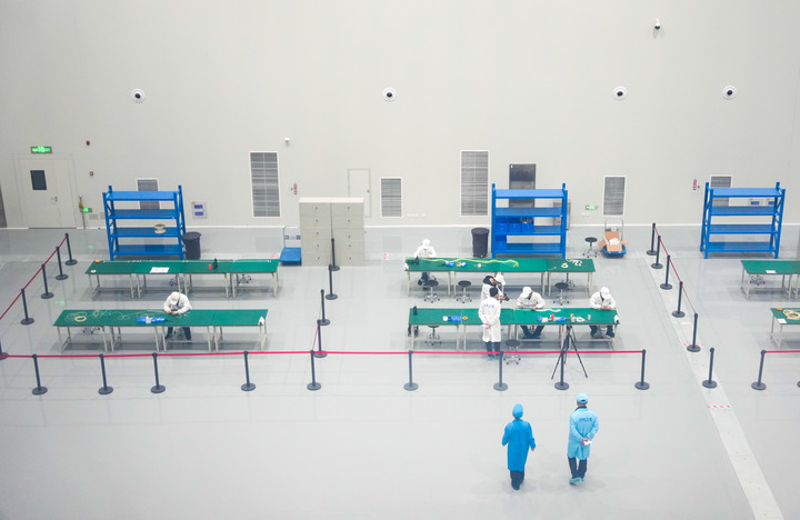 在济南卫星产业发展集团有限公司总装基地,工作人员在卫星生产车间工作(新华社记者 徐速绘 摄)