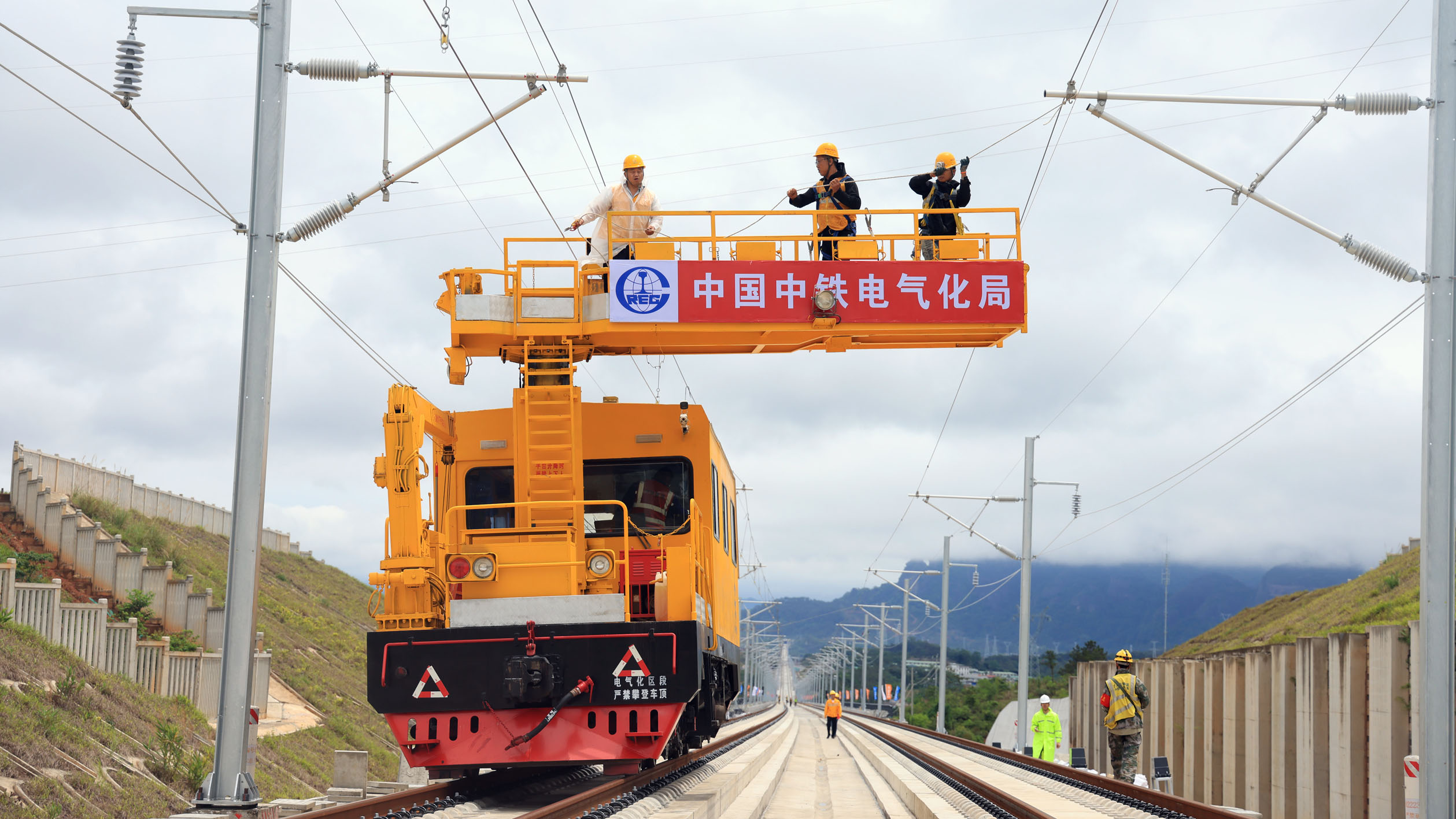 图为施工人员对南珠高铁玉岑段的接触网导线进行加固。
