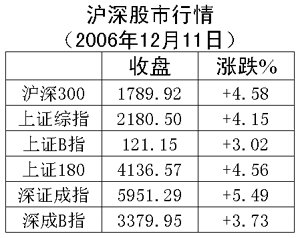 来自沪深证券交易所的数据显示,11日上证综指以2085点低开后迅速重回2100点之上,此后一路震荡上行,尾盘摸高2181.16点,并以接近这一点位的2180.50点收盘,较前一交易日大涨4.15%。深证成指当日上涨309.8点,收盘报5951.29点,涨幅更达到5.49%,再度创下9年新高。