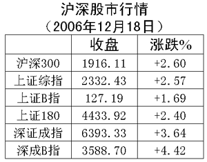 来自沪深证券交易所的统计数据显示,当日上证综指开盘2277.28点,最高2335.23点,最低2277.28点,收盘2332.43点,上涨58.53点,涨幅2.57%;深证成指开盘6184.26点,最高6425.23点,最低6184.26点,收盘6393.33点,上涨224.84点,涨幅3.64%。截至收盘,沪深股市主板共成交840亿元,成交量温和放大。