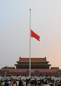 天安门广场下半旗悼念遇难同胞。新华社记者:唐召明 摄