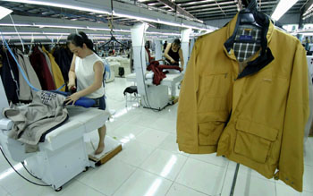 近年来,大批制衣、纺织等外资企业进入吉林省延边朝鲜族自治州珲春市纺织工业园区,制作的服装远销韩国、日本、东南亚等地。2006年,该园区年产成衣3000多万件、纱产量达5000多万吨,产值达4亿多元。图为几名熨烫工人在珲春纺织工业园某制衣车间熨烫服装。新华社记者 迟海峰/摄 |