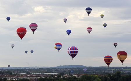 今年正值现代热气球运动诞生50周年。8月12日至15日,英国西南小城布里斯托尔举行了一年一度的国际热气球节。布里斯托尔热气球节创立于1979年,是西方规模最大的热气球节之一。今年有100多个传统和新颖造型的热气球参与放飞,其中包括苏格兰传统风笛造型和首次亮相的龙造型热气球。记者