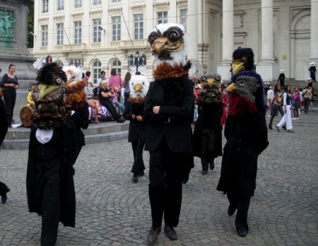 8月13日至22日,比利时首都布鲁塞尔举办了一年一度的仲夏节,爱好音乐的休闲度假者可以尽情享受75场露天音乐会,30场室内音乐会,以及其他艺术活动。图为一些参加布鲁塞尔仲夏节的艺术家在市中心街头表演鸟舞。记者王晓郡/布鲁塞尔报道