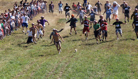 8月14日,曾经是年初温哥华冬奥会雪上项目主赛场的惠斯勒迎来了一年一度的滚奶酪节。参赛者奔跑追逐从山坡上滚下的一个5公斤重的奶酪,最先抓到奶酪者为胜。加拿大滚奶酪节借鉴了英国具有200多年历史的类似传统节日。据组办者介绍,98%的加拿大人常吃奶酪,而加拿大产出的奶酪有600多种。记者