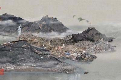 | 姚璐的作品,远看仿佛是青山绿水、诗情画意的水墨山水画,仔细一看,画中的高山外层都是绿色的防尘布,里面掩盖着的是巨大的垃圾堆 |