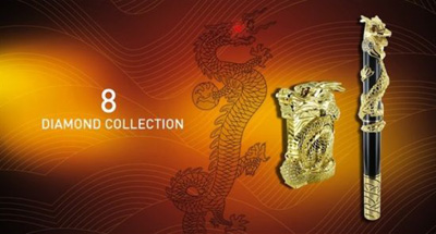 总共分为三个系列。第一套是“龙钻”系列,包括一只书写笔,一个打火机和一只烟灰缸。其中打火机和烟灰缸上的雕龙完全由Philippe