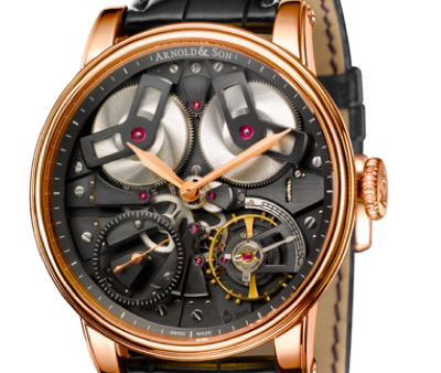 ?亚诺精密记时器的所有技术和美学特点。表盘上展露的双发条盒、设置于十时和二时,提供超过 100 小时的动力储备,摆轮设置于四时及 Deadbeat