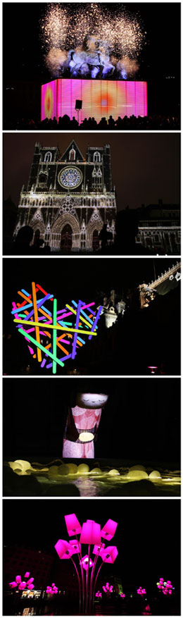 城中心开阔的泰雷欧广场是历年上演“压轴好戏”的地方。今年这里展示的灯光节目是《强光》。广场周边的建筑物外墙面成为天然的“幕布”。站在广场中间,只见“幕布”上成千上万只五颜六色的烛灯如流星般迎面飞来。设计师们用光线勾勒出房屋的线条,再通过灯光将其任意拉伸扭曲。在音乐的衬托下,房屋时而膨胀,时而倾斜,最后每块玻璃窗和廊柱纷纷坠落,大厦在瞬间坍塌,给观众带来强烈的视觉冲击。