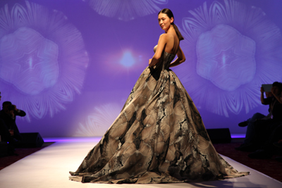 据悉,活动主办方特邀国内著名服装设计师武学凯以纤维为主题献上了一场时装秀。图为模特在展示武学凯作品。