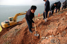 10月18日,施工人员正在刘家峡库区沿岸施工。当天,总投资2.26亿元的甘肃省永靖县刘家峡库区治理开发工程正式启动。据了解,此工程主要包括刘家峡水库环库公路建设、炳灵湖北岸绿色长廊建设和环库公路电力建设。今年计划人工造林6019亩,修建全长89.985公里的环库公路。刘家峡库区治理开发,对保护黄河上游生态,壮大当地旅游产业具有积极作用。