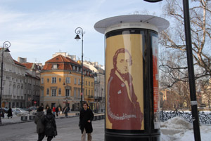事实上,自波兰政府启动“肖邦年”活动以来,首都华沙便掀起了宣传肖邦的热潮。报纸、电视、电台等媒体都在大力宣传,以不同栏目、多种方式介绍“肖邦年”活动安排。波兰国家电视台更开设了“肖邦2010”专题节目。 在华沙街头,随处可以看到一种类似邮筒形状的圆形物体,平时是用来张贴宣传广告的。现在则贴满了肖邦音乐会的宣传品。在华沙,一些俱乐部、音乐沙龙以及小型剧场不定期地举行着各种形式的小型音乐会,有的凭票入场,有的免费入场。 今年初,在华沙大街上你还会看到车身涂满肖邦名字和头像的出租车。这或许是向国外游客介绍波兰,介绍肖邦最直接、最有效的宣传方式。当游客走下飞机,乘坐在印有肖邦名字和头像的出租车上,聆听着肖邦的音乐,想要忘记自己身处波兰都很困难。 不仅如此,华沙街头还出现了一种多媒体音乐长椅。这种长椅由瑞典花岗岩制成,内置多媒体音乐播放器,游人只需触摸播放键,就能听到肖邦的作品。长椅上还刻有地图,用波兰语和英语记录了肖邦的生活点滴。 此外,“肖邦年”内在华沙出生的婴儿,都将得到由华沙市长赠送的一份特别礼物:一套宝宝连身衣,衣服的前襟印有肖邦头像,还有一句评价肖邦的名言:“生于华沙,灵魂属于波兰,才华属于世界”;衣服的背面则是一段马祖卡舞曲的音符。 与此同时,全世界都在以各自不同的方式用音乐纪念着肖邦。中国钢琴家更是在国际“肖邦年”活动中大放异彩。在中国国内的各大城市,肖邦音乐已成为各大剧院、音乐厅中的绝对主题。人们将能在身边层出不穷的纪念活动中重温那诗意盎然的琴声。 |