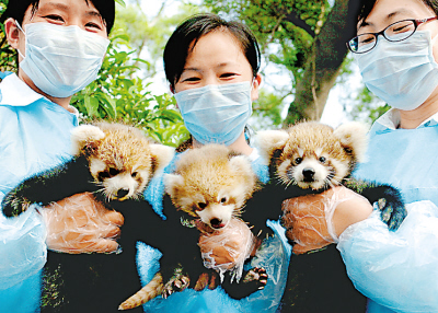 福建福州熊猫世界的小熊猫“思思”7月25日顺利产下的三胞胎日前满月,再次创下小熊猫在人工饲养环境下成功繁育多胞胎的纪录。