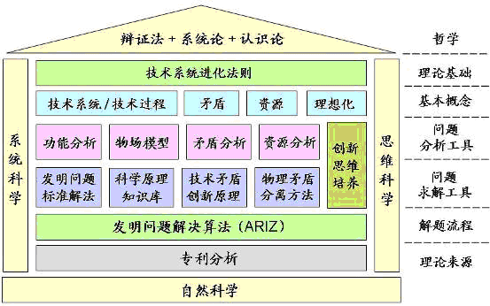 Altshuller)所提出的,他从1946年开始个人对专利的潜心研究,直到后来领导着数十家研究机构、大学、企业组成的TRIZ研究团体,通过对数十万件的高水平发明专利所做的长期的分析、归纳、总结等研究工作,基于辩证唯物主义的认识论、矛盾律和系统论的思想,发现了人类进行科学研究和发明创新的背后所遵循的客观规律,提出了有关发明创新问题的基本理论。截至到本世纪初,所分析的专利数量已经超过了250万,围绕创新,TRIZ已经构成了较为丰富和完备的理论体系。