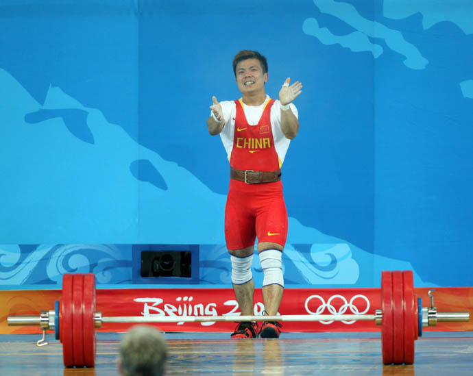 8月11日,中国选手张湘祥庆祝胜利。当日,张湘祥在北京奥运会举重男子62公斤级决赛中以319公斤的总成绩获得金牌。