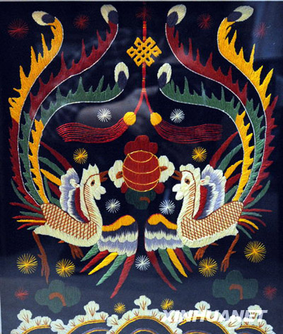 这是黎锦作品双凤朝阳(摄于11月18日)。海南黎锦织造已有3000余年的历史,它既是黎族同胞日常穿着的衣物,也是一种精美的艺术品。随着机织布的普及,古老的黎族织锦技术日渐没落后继乏人。海南传世黎锦工艺研究所近年来致力于黎锦技艺的研究发掘和市场推广,研究所在海南黎族聚居的琼中、东方、五指山等市县寻找到具有织锦技术的黎族妇女450多人,组织她们用传统的织锦技术手工织造黎锦,由研究所负责收购和推广销售,既为黎族妇女们提供了增加经济收入的渠道又使古老的黎族织锦技术得以流传并走向市场。日前,该研究所已经在新落成的海南省图书馆设立了永久性的黎锦展览展示大厅“黎锦坊”,使黎锦这一古老的传统工艺得以发扬光大流传于世。 | |