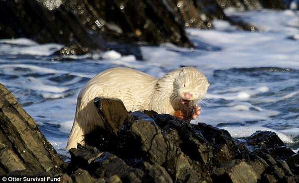 摄影师杰克小姐无意中在苏格兰东北部的马里海岸上发现了一头全身长满白毛的水獭,当时它正在岸边岩石上享受午餐。她说自己感到非常幸运,因为在野外看到白化水獭是极不寻常的事,因为全世界都很难找到这样的白色水獭了。