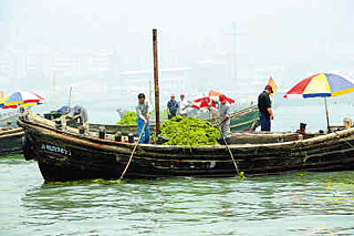 | 7月6日,渔船在银海帆船训练基地打捞浒苔。来自青岛、日照、烟台、威海等城市的1100多艘渔船参与了海上打捞浒苔行动。新华社记者