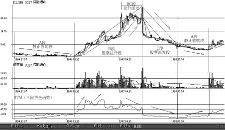 图2-6股票走势A-B-C三段实战示意图 ●从1998年8月24日开始3TM开始上升,说明庄家和跟庄者资金又秘密进入股市,另一轮循环的A段即将开始。1999年5月17日,3TM急促上升由负数变为正数,庄家和跟庄者大量资金进入,股票市场又进入多头控制,历时9个月后A段结束,B段开始。 二、3TM监视资金函数介绍 (一)引言 3TM监视资金函数是作者发明的专门用于测量和监视庄家和跟庄者进入股市资金数量情况(为了保护广大散户的利益,防止庄家和跟庄者利用该函数进行反向操作,破坏该函数的准确度,在此计算公式暂不公开)的一项指标。3TM监视资金函数的基本原理如下: 股市中股价的升跌是被庄家和跟庄者控制的。那么庄家和跟庄者又是如何控制股票的价格呢?庄家和跟庄者就是利用手中的资金和筹码优势来拉升和打压股价的。股价无论是升或跌,他们都能赚到钱。 按概率统计理论和随机过程分析,如果一只没有庄家参与的股票,其每天的交易成交量基本相等,股价基本不会发生太大变化。一旦庄家介入这只股票后,为了影响股票的价格,庄家和跟庄者一定设法打破这个平衡。如他们希望股票的价格上升,就会投放资金加入买方阵营,使股价上升。如果他们希望股票的价格下降,他们就会投放筹码加入卖方阵营,使股价下降。一个有经验的操盘手,可以用很少的资金和筹码在关键的时间和部位介入,让股价大起大落。 在股市中很多人不理解这种现象:连续几天股价一直上升,皆大欢喜。当大家正在高兴之时股价突然大幅跳水,一落千丈,每一个买进股票的人都赔了本。这种现象的起因就是庄家和跟庄者在低位买进筹码,买方阵营强大,股价上升。当庄家和跟庄者手中有了足够的筹码,反手做空,加入卖方阵营,在高位向市场大量抛售手中筹码,使股价大幅跳水,制造空头气氛和空头陷阱,在低位又把筹码捡了回来。同时,又将刚捡回来的筹码用更低的价位向市场抛售,造成股价再次下降,庄家和跟庄者则在更低的价位又把筹码捡回来。如此反复进行下去,直到股价跌无可跌,再没有散户的筹码卖出,股价就此止住。庄家和跟庄者在高位抛售筹码,在低位接回更多的筹码,通过打压股价同样可以获得丰厚的利润。 投资者可从3TM函数的变化中看到,庄家的资金总是与散户唱反调,这是市场上一对矛盾的资金。 1997年,香港金融危机的起因就是世界上一些金融投机家用美元向香港某银行抵押借贷港币,然后向市场抛售港币。同时又在港币低价位时收购港币,购回的港币又抛向市场。经过几个回合的抛售和收购,使港币大幅贬值,投机家赚了大钱。香港政府为了保住港币不贬值,打败投机者,不得不提高银行利率,曾一度把隔夜拆借利率提高到30%以上,并禁止香港银行向投机者借钱。此举虽然打退了投机者,保住了港币不贬值,但使香港的经济损失惨重,香港恒生指数从16700点跌到8000多点,引发了香港金融危机。 在股市中,股价的打压和拉升都是庄家和跟庄者惯用的获利手法。他们在打压中买进筹码,在拉升中套取现金,这样周而复始地进行下去。庄家和跟庄者拉升和打压股价常采用什么手法呢? (二)庄家和跟庄者在拉升股价阶段的特点 庄家和跟庄者投入大量资金,形成主动性买盘,横扫卖一、卖二和卖三的筹码,股价一路攀升,很快升到涨停板。或者连续多日用巨大的买单挂在买一上,所有市场卖出的股票均被庄家和跟庄者吃进,股价封住10%的涨停板。这是属于急促拉升,庄家和跟庄者不希望散户在股价低位买进便宜货。如深圳深天地股票于2000年1月27日从底部启动时,庄家和跟庄者连续以巨大的买单在买一上封住涨停板,股价连升6天,每天涨10%。第7天用封涨停板的方法在涨停板处派货,派货达1850万股,换手率35%,拉出一根长长的下影线。在股价低位没有一个散户买到筹码。第7天后买到筹码的都是庄家和跟庄者在高位派出的货,风险极大,稍不小心就被套住。 在每天的买卖活动中,如委比成正数,形成了多头气氛,很多短线客户始终监视成交窗口中买一、买二、买三、卖一、卖二和卖三的变化。庄家和跟庄者会在这关键时刻投入一点资金,加强多头气氛,使股价缓慢上升,让委比始终为正数,以吸引短线客户跟上。此举是庄家和跟庄者故意制造股价缓慢上升的迹象,实际上庄家和跟庄者此时则趁机在股价缓慢拉升中派货。 (三)庄家和跟庄者打压股价的特点 庄家和跟庄者向市场抛售筹码,一路形成主动性卖盘,横扫买一、买二和买三出现的买单,使股价一路下降,很快下降到跌停板。或者连续多日以巨大卖单封住跌停板,散户所接的货都是庄家和跟庄者在跌停板处挂的卖单,这是庄家采取急促打压手法。因为庄家和跟庄者不希望散户在股价高位卖出获利筹码,他们千方百计要套住散户。这是股价在高位时庄家和跟庄者把货已派完后希望股价急促下降而采用的方法。 在每天的买卖活动中,如委比成负数,形成了空头气氛,很多短线客户会始终监视成交窗口中买一、买二、买三、卖一、卖二和卖三的变化。庄家和跟庄者会在此刻抛出一点筹码,以加强空头气氛,使股价缓慢下降,让委比始终成负数,以吸引短线客户跟着抛掉手中筹码。此举是庄家和跟庄者故意制造股价缓慢下降的迹象,而实际上庄家和跟庄者此时则趁机在股价缓慢下降中吸货。 (四)庄家和跟庄者在涨停板处抛售筹码特点 在2001年,很多股票连续走出了几个涨