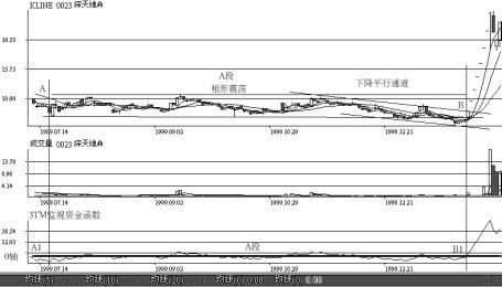 (三)A段的基本特征和图形实战案例之二 图2-13是深圳深天地在1999年7月16日至2000年1月12日股价被拉升前的走势图,是一个典型的A段日K线走势图。从 图示第1个交易日开始,庄家和跟庄者采用箱形震荡小量吸货,中途有5个振荡波,每日成交均量和换手率均在0.8%左右。2000年1月12日,3TM上穿0轴,股价突破平行箱形震荡,成交量放大,表示A段结束。A段一共经历了6个月约120多个交易日,股价台阶上升幅度是0。 图2-13实战中A段日K线走势图 在图2-13中: