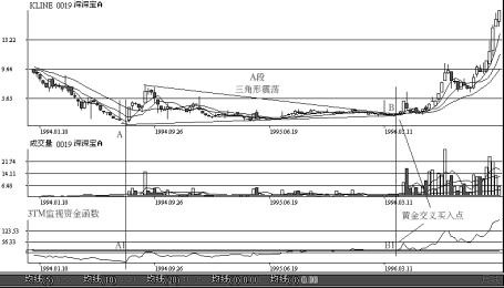 ●A1点的3TM的值最小。从A1点后,3TM曲线在0轴线上下小幅波动,A1点是A段的起始点。 ●B1点是3TM从下至上穿过0轴,A段结束,B段开始。 ●A段的日K线走势呈平行线箱形震荡。在接近底部时,走出了下降平行线箱形震荡,股价和3TM呈底背离。 ●在A段每日的成交量萎缩。120日成交均量是43万股,每日的换手率是0.8%。这就是说A段的总换手率达100%。 ●2000年1月12日前5日成交均量是55万股,11日是80万股,12日3TM从下上穿0轴,形成黄金交叉,说明庄家和跟庄者进入股市资金大幅增加,12日成交量是160万股。这是投资者进入股市的绝好机会。 (四)A段的基本特征和图形实战案例之三 图2-14是深圳深深宝在1994年1月至1996年1月股价被拉升前的周K线和3TM曲线走势图。 在图2-14中: ●A1点的3TM值最小,对应的日K线图A点(1994年7月25日)的股价是地价(2.20元)。 ●从A1点后3TM曲线上升,在0轴线下小幅波动。1995年6月到1996年1月,3TM曲线沿0轴小幅波动,说明庄家和跟庄者进出股市的资金非常少。A1点是A段的起始点。 ●“A至B”段是股价拉升前的A段收购段。A段在周K线图上走出了三角形震荡走势,历时1年零4个月,成交量萎缩,日成交均量为20万股,换手率为0.7%。