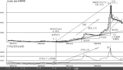 (五)B段三台阶图形和基本特征实战案例之三 图2-19是深圳亿安科技(0008)在1998年1月至2000年6月前后周K线走势图。这是一幅典型的B段三阶周K线和3TM走势图。 在图2-19中: 图2-19B段三台阶图形和基本特征实战案例之三 ●A1点(1998年9月14日,股价6.50元)是3TM上穿0轴,对应的周K线图A点是金四线交叉,3TM上升,庄家和跟庄者进入股市的资金增加,成交量放大,A段结束,B段开始。 ●B点是天价点(2000年2月17日,股价126.31元),B段结束,C段开始。 ●“A至B”是B段股价拉升段。走出了三台阶走势,3TM上升,成交量放大,股价上升,三者成正比关系,历时1年零5个月,股价上升(126.31-6.50)/6.50×100%=1843%,每日升幅5.4%。 ●AB线是投机拉升趋势线,该趋势线又由三条台阶趋势线组成。 ●CC是中价阶两点的连线,它是中价阶的上升斜率,也是股价上升通道的下支撑线。股价在高价阶跌破该支撑线是出货时间。 ●“A1至C1”段是多头控制市场。A1至B1是3TM资金函数呈上升趋势,股价保持上升势头。