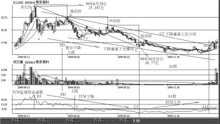 (四)C段三台阶图形和基本特征实战案例之一 图2-23是上海南京高科(600063)在1999年6月至1999年11月前后的走势图。这是一幅典型的C段三阶日K线、成交量和3TM 走势图。从图中可清楚地看到股价到达天价25.181元后转入C段的情形。进入C段后,成交量和换手率极度萎缩,当成交量和换手率到达1%以下时,股价开始小幅下降,呈逐阶下降走势。 在图2-21中: ●B点(1999年6月29日,股价25.181元)是天价,B点对应的B1点是3TM最高点,在B1点后,3TM下降,庄家和跟庄者进入股市的资金减少,成交量减少,股价下降,B段结束,C段开始。 ●“B至C”是C段股价派货段,走出了下降三台阶走势,3TM下降,成交量减少,股价下降,三者成正比关系,历时4个月,股价下降(16.77–25.18)/25.18×100%=–33%。 ●B至C连线是投机派发趋势线,斜率是负数。该趋势线又由高价趋势线、中价趋势线和低价趋势线组成。 ●从图中可用计算机算出三个台价的下降高度、经历时间、成交量和换手率。 图2-23C段三台阶图形和基本特征实战案例之一 ●CC是中价阶两点的连线,它既是中价阶的下降斜率,也是股价下降通道的上压力线。股价在低价阶上升并突破该压力线时是进场时间。 ●1点是3TM从上下穿过0轴形成的“死亡交叉”,是卖出股票的时间。 ●“1至A11”段是空头控制的市场。B1至C1是3TM资金函数呈下降趋势,股价保持下降势头。此时投资者应离场。 ●C段三台阶图形的划分有一些类似波浪理论的调整浪走势(图中a-b-c调整三波的标注)。但两者有本质的区别:C段三台阶划分是为了计算机数据统计、分析和对比的需要,是计算机对股价下降时的数据取样时间空间和数学模型,有确定的取样点。 (五)C段三台阶图形和基本特征实战案例之二 图2-24是深圳深发展(0001)在1999年5月至2000年6月前后的走势图,是一幅典型的C段三阶日K线、成交量和3TM走势图。图中看到股价到达天价29.40元后转入C段的情形。进入C段后,成交量和换手率极度萎缩,在1%以下,股价呈逐阶下降走势。