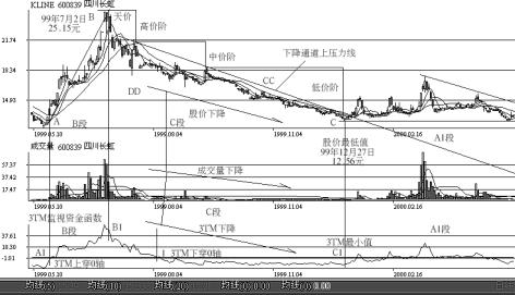 (六)C段三台阶图形和基本特征实战案例之三 图2-25是上海长虹(600839)1999年5月至2000年5月前后的走势图,也是一幅典型的C段三阶日K线、成交量和3TM走势图。从图中可清楚地看到股价到达天价25.15元后转入C段的情形。进入C段后,成交量和换手率极度萎缩,到达1%以下,股价呈逐阶下降走势。 在图2-25中: ●B点(1999年7月2日,股价25.15元)是天价,对应的B1点是3TM最高点。在B1点后3TM下降,庄家和跟庄者进入股市的资金减少,成交量减少,股价下降,B段结束,C段开始。 图2-25C段三台阶图形和基本特征实战案例之三 ●“B至C”是C段股价派货段,走出了标准的下降三台阶走势。3TM下降,成交量减少,股价下降,三者成正比关系,历时5个月,股价下降(12.56–25.15)/25.15×100%=–50%。 ●B至C连线是投机派发趋势线,斜率是负的。该趋势线由高价趋势线、中价趋势线和低价趋势线组成。 ●图2-25中,计算机可算出三个台价的下降高度、经历时间、成交量、换手率和持股人数变化比。 ●CC是中价阶两点的连线,它是中价阶的下降斜率,也是股价下降通道的上压力线。 ●1点是3TM从上下穿0轴形成的死亡交叉,是卖出股票的时间。 ●B1至C1是3TM资金函数呈下降趋势,说明庄家和跟庄者一路从股市上抽出资金,成交量萎缩,股价保持下降势头,此时投资者应离场。 ●C1点是3TM的最低点,对应的C点也是股价的最低点。该点表示C段结束,又一轮收购段(A1)段开始。A1段呈直角三角形震荡,并逐渐收敛。 ●DD三条斜线表示3TM下降,成交量下降,股价下降,三者成正比关系。 ●图中A1点是3TM从下上穿0轴,形成黄金交叉,上升段(B段)开始,是入市的好机会。 |
